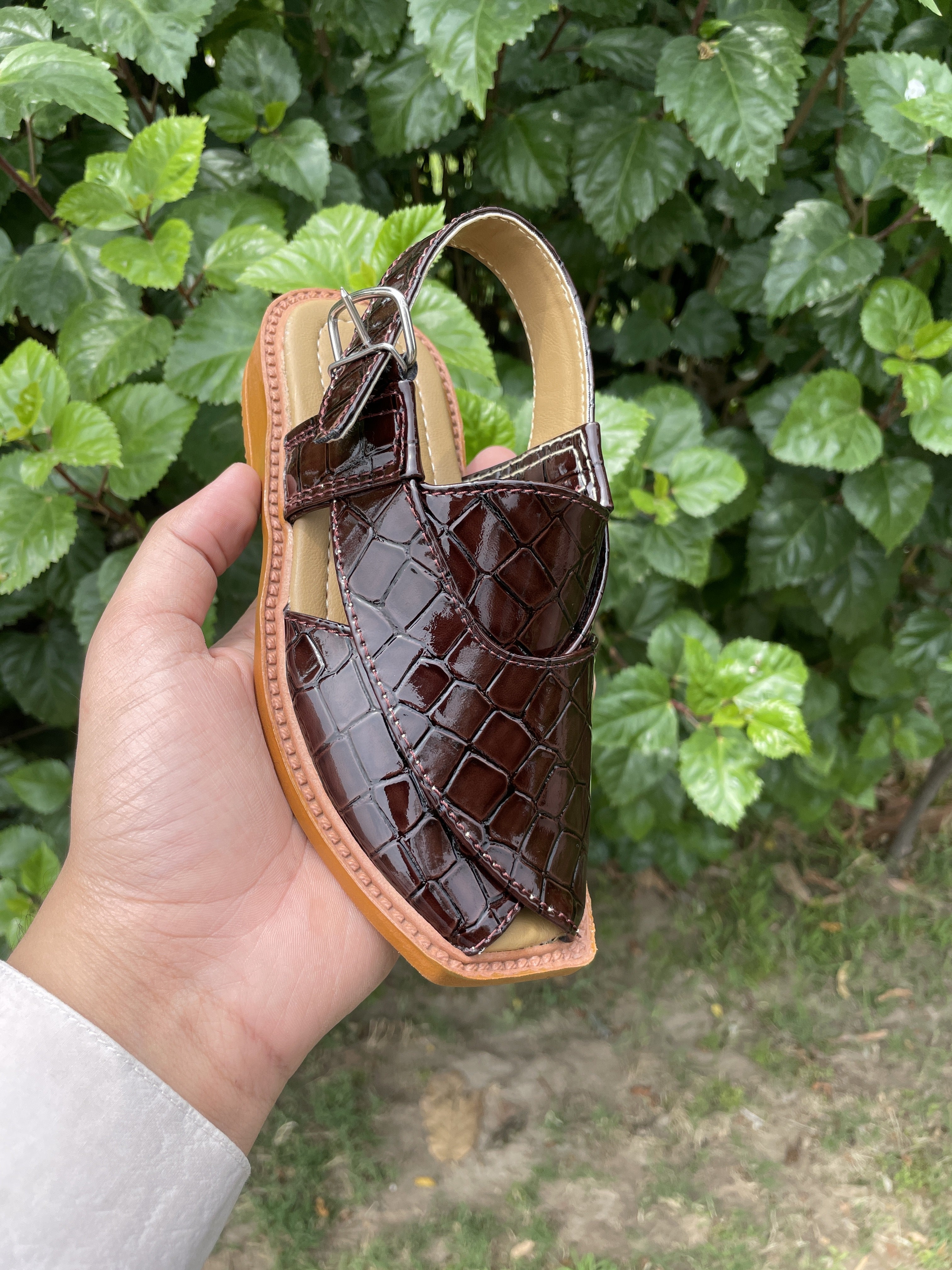 Enhance your child’s ethnic look with our premium Kids Crocodile Peshawari Chappal, the perfect choice for traditional Pakistani footwear for boys. Designed with a stylish crocodile-texture finish, these boys Peshawari chappals are crafted from high-quality faux leather that delivers both durability and a bold, fashionable appearance. Whether it's for Eid, weddings, family functions, or cultural events, these traditional chappals for kids provide a unique blend of comfort, style, and heritage. The soft cushioned insole and adjustable buckle strap offer all-day comfort and a secure fit, making them ideal for active little feet.